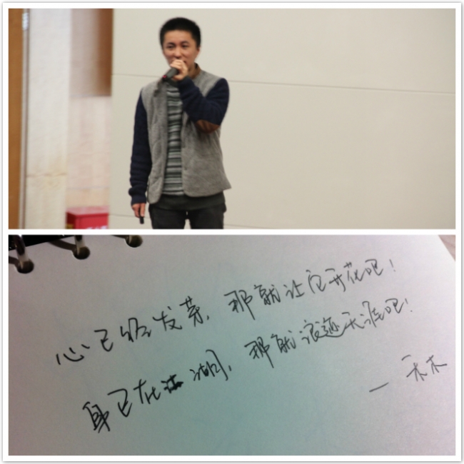 在分享会上,词人、编剧、《姚贝娜-画情》词作者田辰明在18分钟的主题演讲中讲述了他的创作生涯与心得:用作品拓下嬗变的人世间偶然停格的情感,内心最真的感受才是创作最本真的意义;第二位分享人,独立音乐人、中国爵士乐歌手、词作者陈胤希则用自己独特的声音,从用不同的爵士风格诠释儿歌《两只老虎》到布鲁斯《北京的空气》,陈老师让大家深深记住了爵士的本质:自由、创新与突破;著名评弹艺术家、国家一级演员周红老师在分享会上为发扬中国传统曲艺—苏州评弹不遗余力,现场观众皆为老师对传统曲艺的坚守与推广所做的努力所打动。老师现场为大家带来了最经典的苏州评弹《新木兰辞》,吴音轻柔,弦琶琮铮,大家沉醉在吴侬软语中,被千年前的故事所打动;户外领队,背包客小木为大家带来了最年轻的声音,和同学们分享了他不一样的大学生活---在行走中发掘梦想。“在路上我们能看到不同的生活、不同的世界,进而寻找自己想要的是什么。”最后,我校人气教师、当代艺术家鲍峰老师带来了最哲学的思考---非理性与理性的思辨,“真理的第一次呼喊更像是一种呻吟”,鲍峰老师引领同学们用另一种方式去看待世界,同时倡导作为理工科同学的我们更要重视非理性思维,从而做出更广阔的甚至颠覆性的创新。